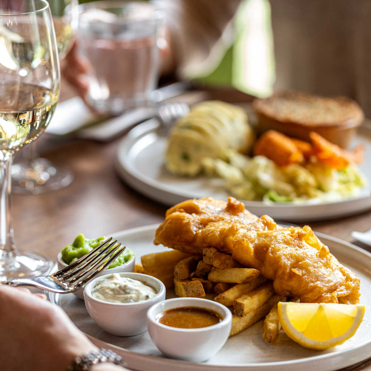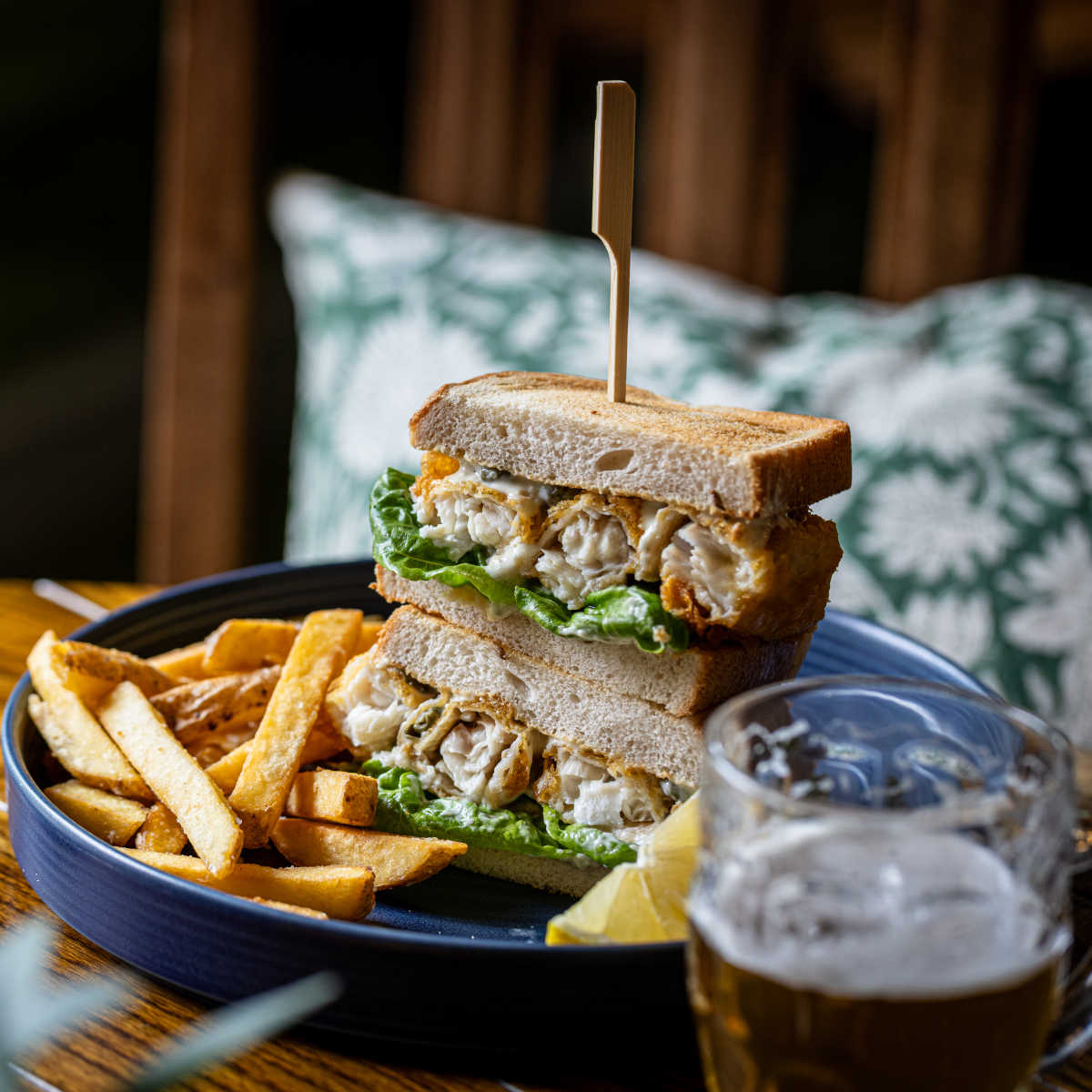 Beer-battered fish fingers, tartare sauce, toasted farmhouse bloomer (†) | 9.50 1087 kcals