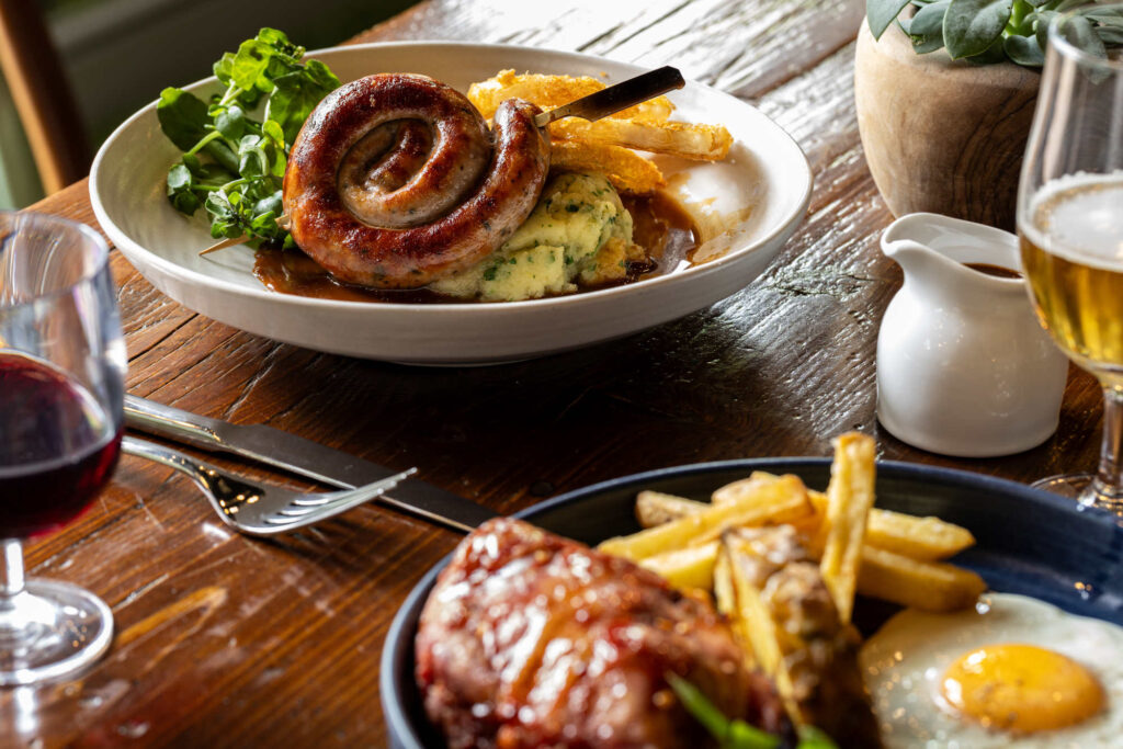 Cumberland sausage ring, herby mash, beer-battered onion rings, gravy | 13.50 927 kcals