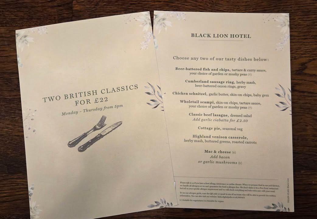Enjoy 2 British Pub Classics for just £22 🇬🇧 Available Monday–Thursday from 5pm Proper pub food, proper value — grab a table! 🍽️🍺 Www.blacklionhotelrichmond.co.uk