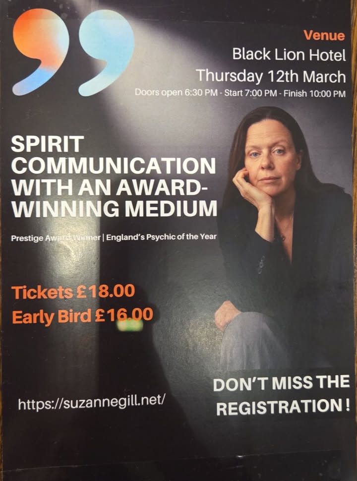 ✨ An Evening of Mediumship with Suzanne Gill – 12th March ✨ Join us on 12th March for a special evening with gifted medium Suzanne Gill. Suzanne will be bringing messages from loved ones in spirit in what promises to be a moving, uplifting, and memorable night. Tickets are limited and expected to sell quickly — be sure to get yours in advance to avoid disappointment.